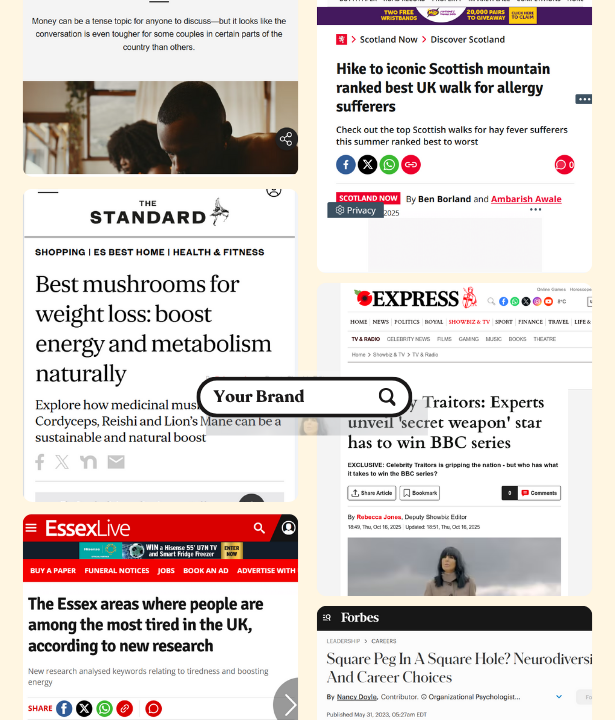 Get seen by your customers in publications like Forbes, The Sun, Daily Record, Health & Wellbeing, Woman’s Own, Men’s Health & 100’s more.
